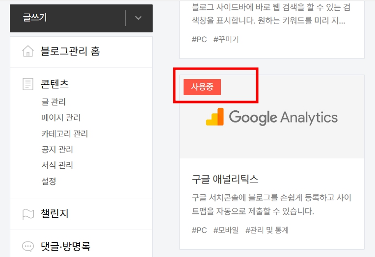 내 티스토리의 플러그인에 들어가 보면 사용 중이라고 뜨는데 활성화되기까지는 약 48시간이 소요된다고 합니다.