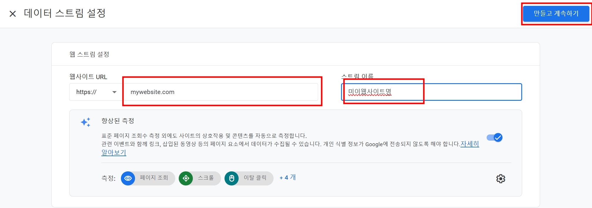 나의 티스토리 사이트 들어가셔서 주소 복사하신 다음 웹사이트 URL에 넣어주시고, 스트림 이름은 내 블로그 이름 넣어주세요.