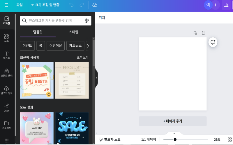 캔버스가 열리고 왼쪽에서 템플릿중에 원하는 디자인의 키워드를 쓰고 검색을 후 다양한 템플릿을 확인할 수 있는데, 마음에 드는 걸로 선택하면 캔버스에 나타납니다.